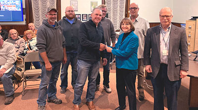 Loop Minnesota officials, Monique and Ross Hammond attended the Commissioning of the Hearing Loop at the Becker Township Board Meeting. Monique congratulates Board Chair Brian Kolbinger.
